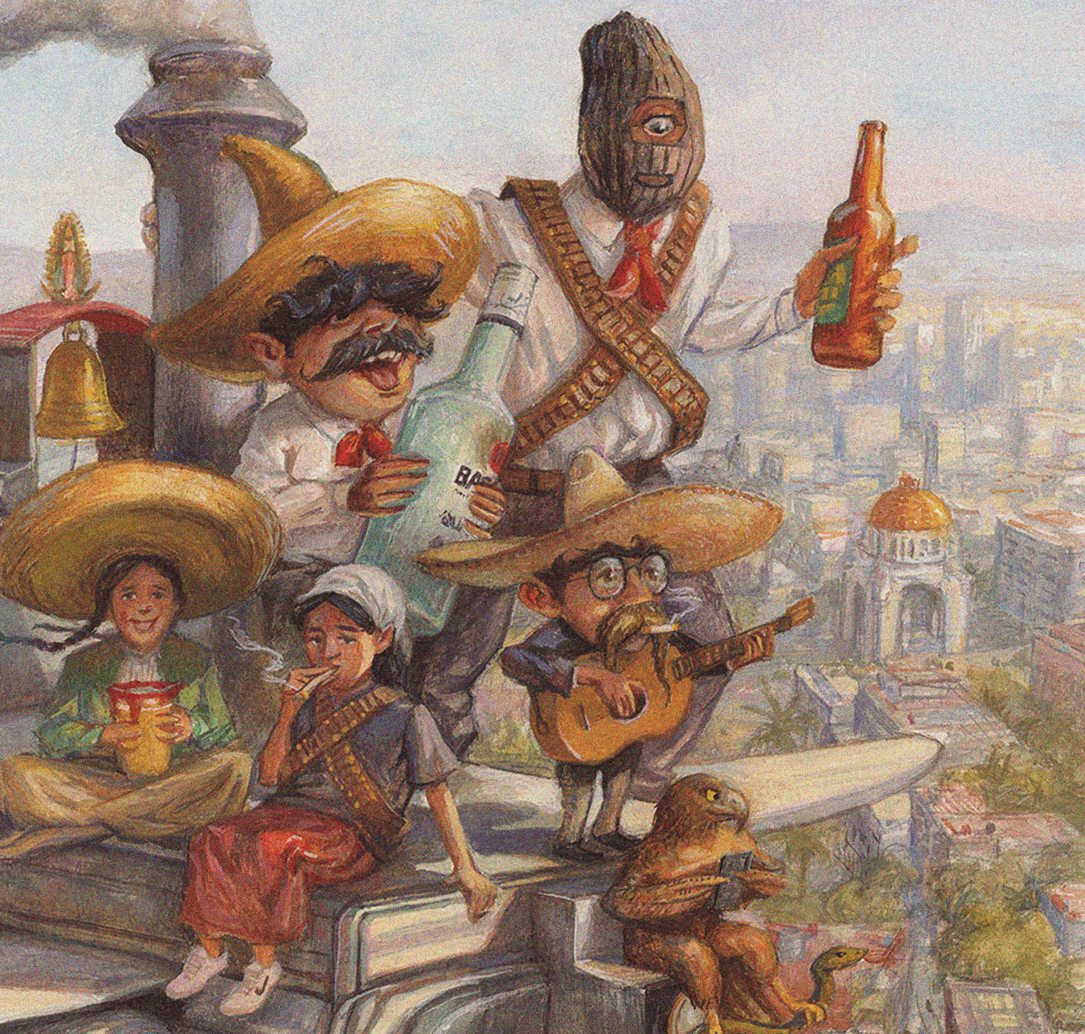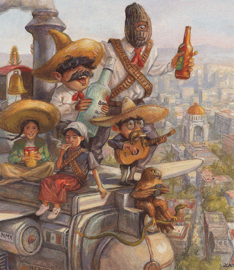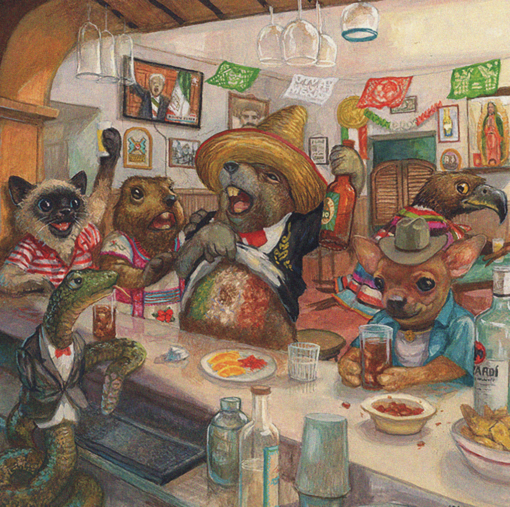 Animales «humanizados» festejan con cerveza, ron, tequila, mezcal y botanas, rodeados de papel picado tricolor. Un perro, un gato y una pareja de ardillas son atendidos por una serpiente que funge de bartender y un águila en el fondo que la observa, quienes remiten al escudo nacional mexicano y la fundación de Tenochtitlan.